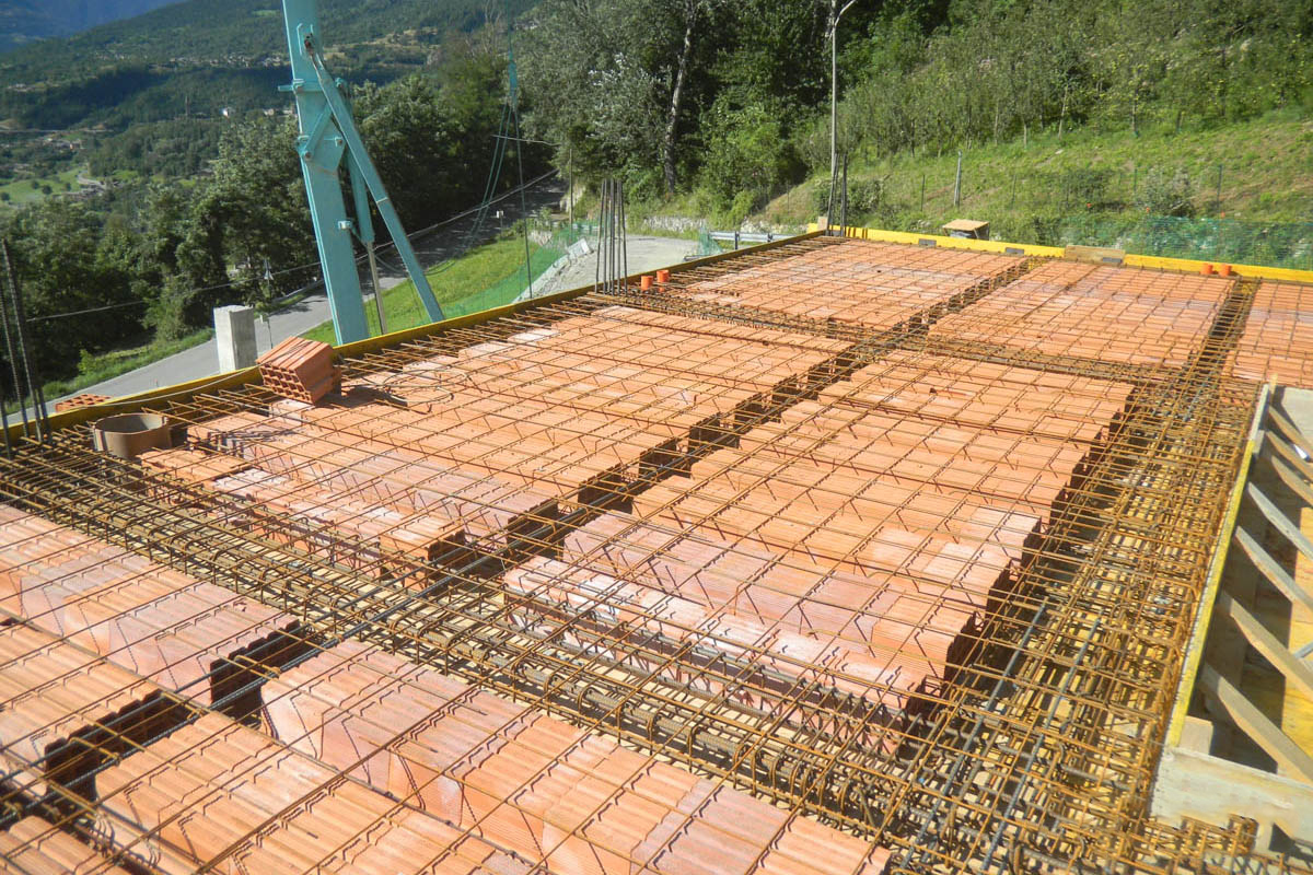 Le strutture portanti sono previste in cemento armato ordinario, con orizzontamenti in solai a predalles e latero cementizi, mentre la copertura ha l’orditura principale e secondaria in legno.